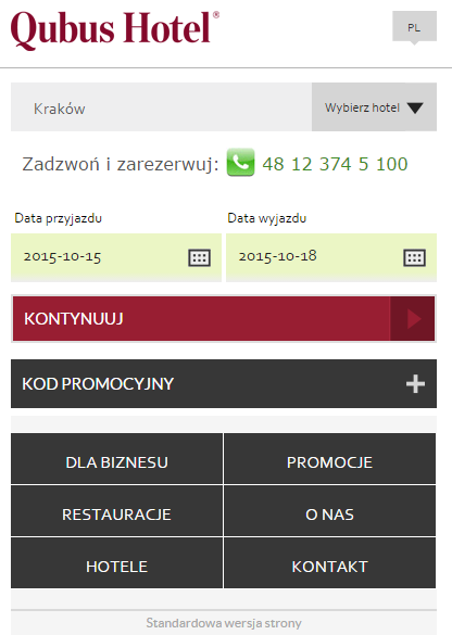 Alternatywą jest stworzenie dedykowanej strony mobilnej, czyli uproszczonej strony z treściami i aplikacjami zaprojektowanymi tylko do korzystania na smartfonach i tabletach. Hotele stosują oba rozwiązania – poniżej wersja responsywna strony sieci Hilton (hiltonhotels.com/pl) oraz dedykowana strona mobilna sieci Qubus (m.cubushotel.com/pl).