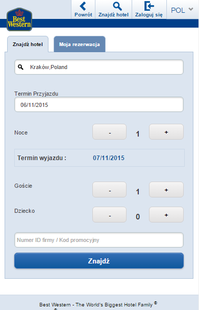 Dobrym rozwiązaniem jest narzędzie lub aplikacja stosowane często przez duże sieci hoteli i wyszukiwarki ofert, które na podstawie kilku danych (m.in.: termin pobytu, liczba osób, standard hotelu, rodzaj pokoju) pokazują oferty hoteli w konkretnej lokalizacji. Co więcej – czytelnie wyróżniają najlepsze oferty, pozwalając jednocześnie na filtry po określonych parametrach (np. parking, dostęp do basenu, gabinetów spa, darmowego wi-fi, itd.) - poniżej przykład ze strony mobilnej m.bestwestern.pl.