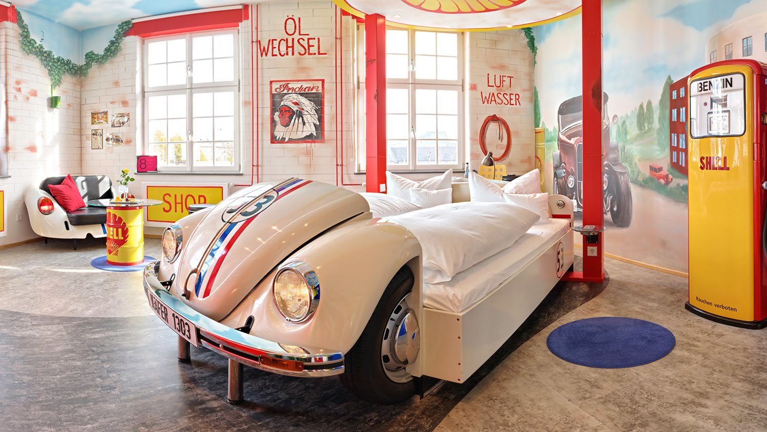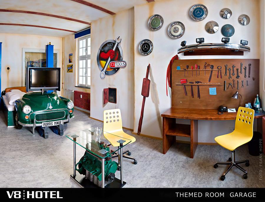 V8 to jeden z tych hoteli, których właściciele z ogromną precyzją dopracowali każdy szczegół wystroju pokojów. A byli przy tym ogromnie pomysłowi. Tematyczne pokoje nawiązują do: wyścigów samochodowych, warsztatu, myjni, tuningowania aut, a nawet do podróży camperem lub jednej z najsłynniejszych tras Ameryki Północnej, czyli Route 66. Ale sam hotel to nie wszystko. Hotel V8 jest częścią ogromnego kompleksu zwanego MOTORWORLD Region Stuttgart, na który składają się także: hale z kolekcją zabytkowych samochodów, restauracje i browarnie. A wszystko nawiązujące tematyką do motoryzacji. To obowiązkowa destynacja dla wszystkich fanów motoryzacji.